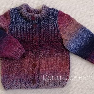 Taille 2-3 ans. Aig. no. 6. Largeur : 33 cm – Hauteur totale : 38 cm Échantillon : 15 m. x 10 cm x 22 rgs Je ne vous suggère pas de laine car mes modèles peuvent se créer avec toute laine ajustée à la grandeur des aiguilles et de l’échantillon. A vous de choisir la laine que vous aimez…